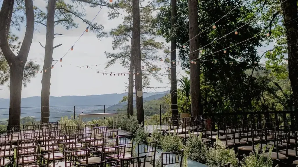 Um espaço para casamento preparado para oferecer áreas distintas (como um deck com vista panorâmica para o altar e um salão anexo para a festa) cria uma transição fluida e contínua entre a emoção dos votos e a alegria da celebração.