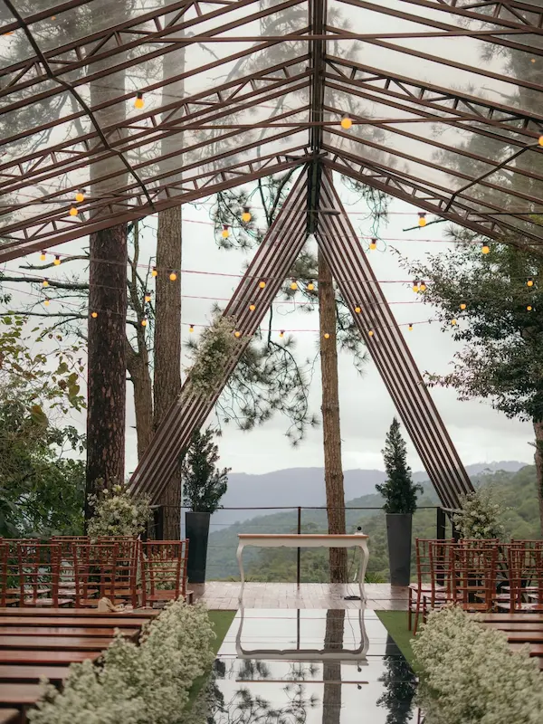 O modelo híbrido, que integra áreas ao ar livre com espaços cobertos, é hoje uma das soluções mais inteligentes do mercado. Ele permite uma cerimônia totalmente integrada à natureza e o aproveitamento máximo da luz natural, enquanto a recepção conta com controle absoluto de iluminação cênica e acústica.