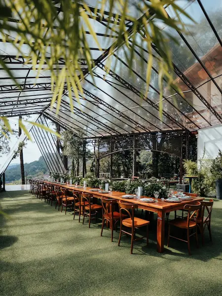 Quando o ambiente dialoga com a natureza, com a luz natural e com a paisagem ao redor, o resultado é uma atmosfera muito mais envolvente quase como se o local participasse da narrativa da celebração.